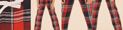 Twill weave. Woven tartan trousers. Fully elasticated waistband with mock drawcord. Plain hem. Tear out label. 100% cotton flannel. 180g