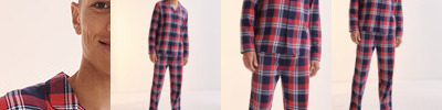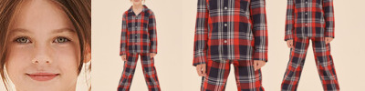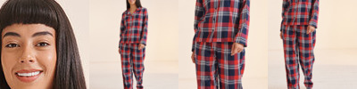 Woven tartan lounge set with plain hem. Shirt with a pyjama collar and pearlised button front, and bottoms with a full elasticated waist. Tear-out label. . Vegan certified.